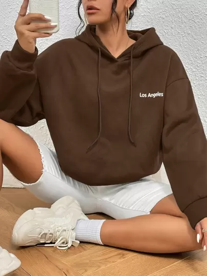 SHEIN Unity 字母圖案落肩袖加絨內裏抽繩連帽衫 - 咖啡棕 - 查看 1
