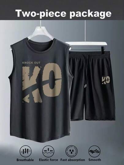 Manfinity Sport Corelite 字母印花圆领背心和抽绳腰短裤运动套装 - 黑色 - 查看 1