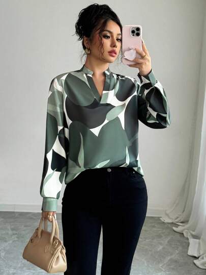 Elenzga 休闲拼色印花缺口领衬衫,适合春秋季节 - 橄欖綠 - 查看 1
