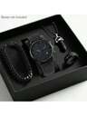 国庆节 3 件休闲时尚男士手表,皮革石英,男士商务运动手表、手链、项链套装适合日常佩戴、感恩节、万圣节、圣诞节、生日派对、斋月,也是完美的礼物