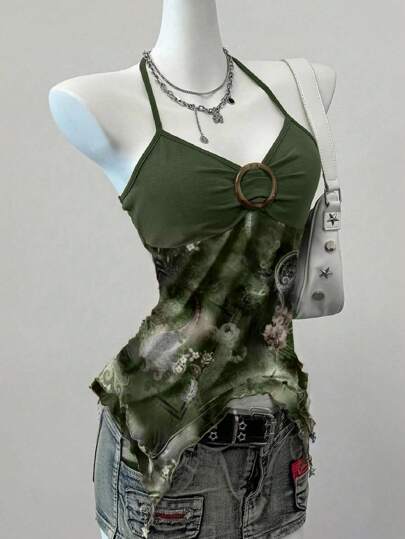 Muchica 休闲简约绿色复古印花图案女式背心,适合夏季 - 綠色 - 查看 1