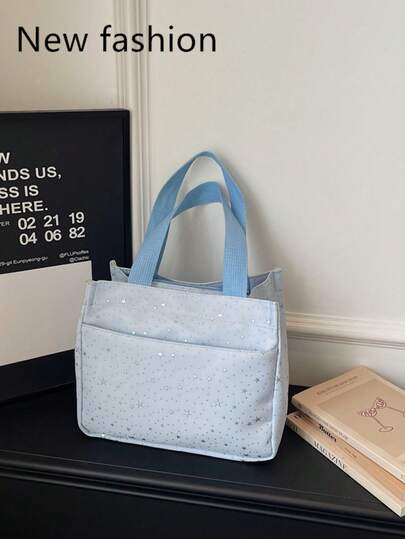 浅蓝色星形帆布手提包,可爱休闲星形图案手提包,轻便大容量,是日常购物、午餐和户外活动的理想之选