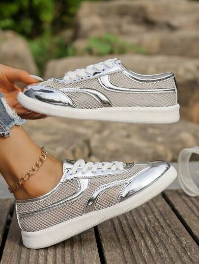 轻便舒适的系带运动鞋,适合青少年,休闲户外活动鞋,透气网眼鞋,适合学生 - 銀色 - 查看 5