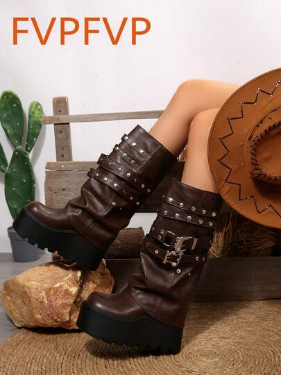 FVPFVP 女士厚底过膝长靴 2025 新款高筒靴,适合娇小身材,棕色复古骑士靴,纯色,TPR 材质(热塑性橡胶),拉链和铆钉装饰,户外,度假,秋冬 - 棕色 - 查看 2