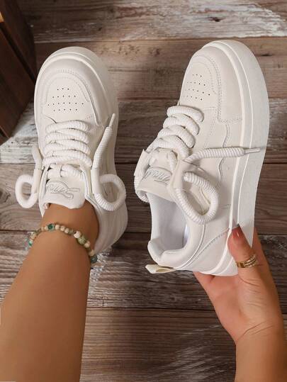 宽版女式春秋时尚纯色百搭拼色厚底系带帆布运动鞋,轻便运动休闲鞋 - 米色 - 查看 1