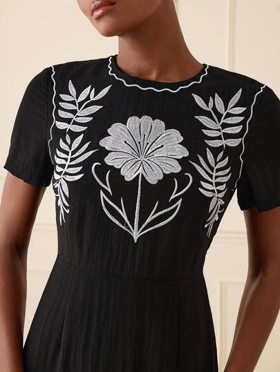 Lilora 女士优雅刺绣亚麻中长连衣裙 - 黑色 - 查看 1