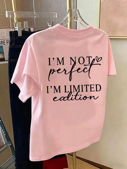 限量版印花女式T恤 | “我不完美”,休闲圆领短袖上衣,春夏时尚粉色