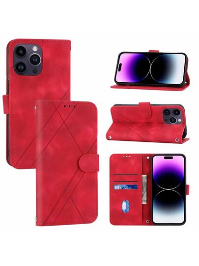 簡約線條圖案,磁翻蓋帶卡槽,錢包式手機殼,pu皮革,手腕掛繩,可兼容iphone手機,適用於iphone15/15plus/15pro/15promax,時尚、休閒、商務 - 紅色 - 查看 1