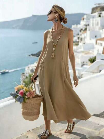 Linhara CURVE 大码梭织休闲度假夏季吊带连衣裙 - 卡其色 - 查看 1