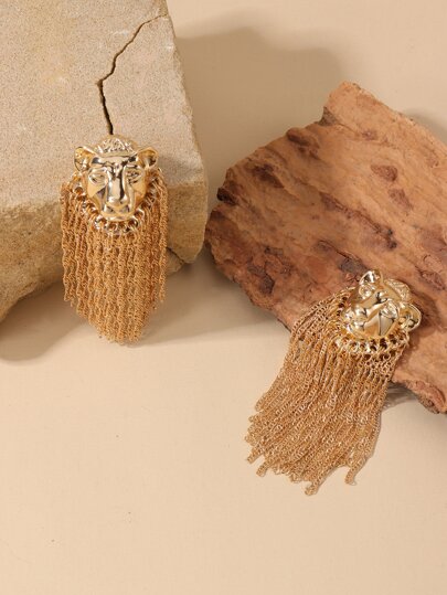 獅子頭和金屬流蘇耳墜 - 金黃色 - 查看 1