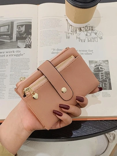 荔枝压纹按扣粉色女士钱包钱包小钱包 - 粉色 - 查看 1