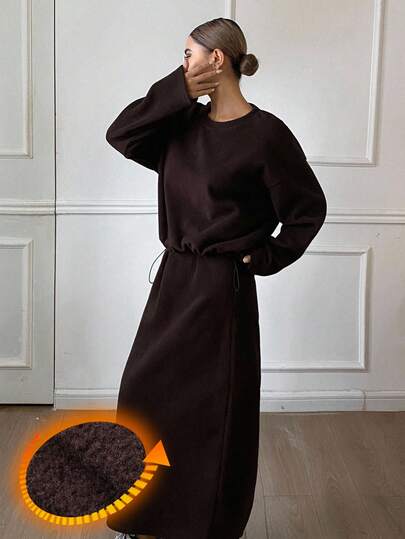 Livesso 秋冬季保暖宽松商务休闲套头卫衣+直筒抽绳腰半身裙两件套,时尚棕色保暖内衬 - 咖啡棕 - 查看 2