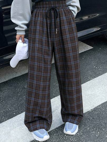 Livesso 女士秋冬格子系带前袋休闲裤 - 棕色 - 查看 1
