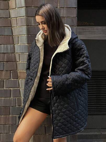 Livesso 女式束腰连帽绗缝拼布仿皮草衬里宽松夹棉外套冬季夹克 - 黑色 - 查看 1