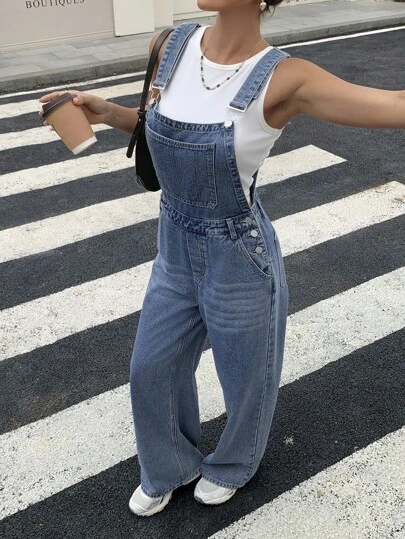 Livesso 女士宽松休闲牛仔背带裤,夏季工装裤 - 藍色 - 查看 1