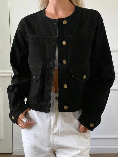 Livesso 女式圆领长袖牛仔夹克,秋季 - 黑色 - 查看 1