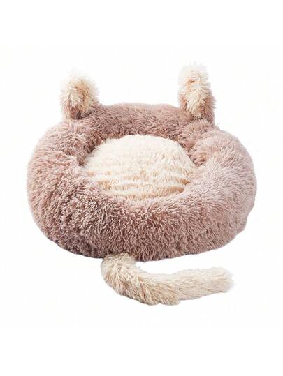 Living And Home Round Plush Pet Dog Cat Calming Bed With Cute Ears - 棕色 - 查看 10
