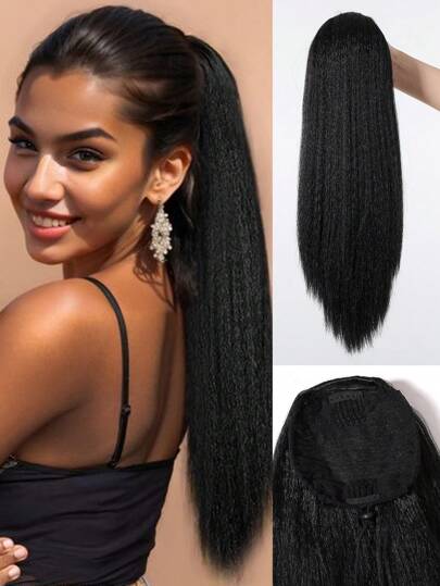 长直抽绳马尾接发夹波浪形合成假发 20 英寸黑色马尾发片女士马尾接发