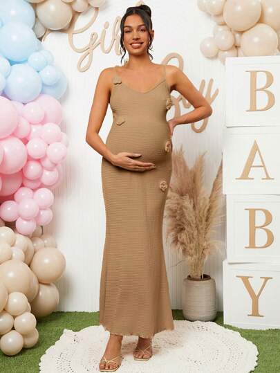 Loomaby 孕妇纯色贴花紧身吊带迷你连衣裙,夏季 - 卡其色 - 查看 1
