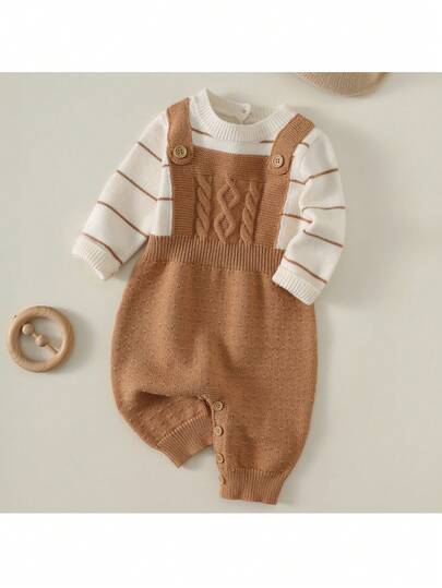 Loomiva 新生儿男女宝宝条纹圆领长袖连体衣,背带裤,两件套 - 卡其色 - 查看 1