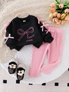 2 件套女婴休闲蝴蝶结印花长袖运动衫和紧身裤套装,可爱又时尚,适合秋季