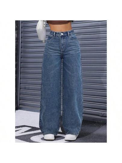 Solid High Waist Wide Leg Slant Pocket Jeans - 藍色 - 查看 1