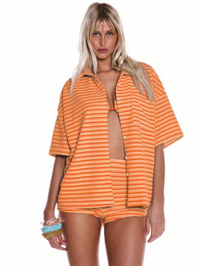 MUSERA 丝绒条纹宽松短袖衬衫,春夏度假海滩可爱假日伊比沙岛海滩机场穿搭秋季 - 橘色 - 查看 1