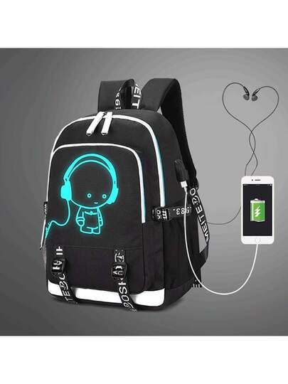 發光印刷帶15英寸筆電隔層的學校背包,牛津布材質(隨機條紋字母設計),多功能usb充電便攜輕巧背包,適用於男女孩女士上學或旅行 - 黑色 - 查看 1