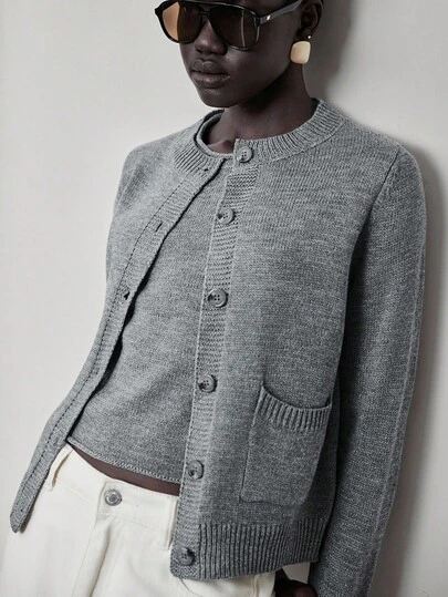 Lumivelle 2 件针织长袖开衫和无袖针织背心套装,百搭 - 灰色 - 查看 1
