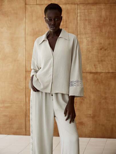Lumivelle 2件套女士休闲开衫衬衫和蕾丝下摆裤子 - 卡其色 - 查看 6