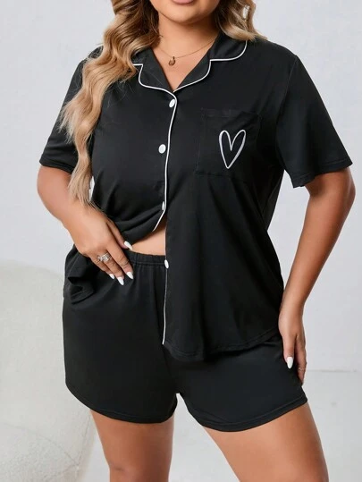 LuxeNights 加心印花对比滚边睡衣套装/睡衣套装 - 黑色 - 查看 1