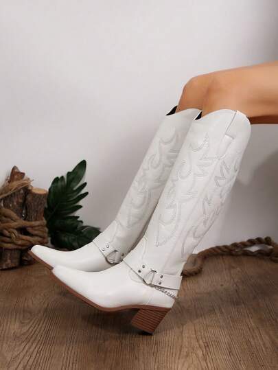 Kendall Jenner風格刺繡靴,2024歐美新款女士復古膝高牛仔靴,厚跟 - 白色 - 查看 1