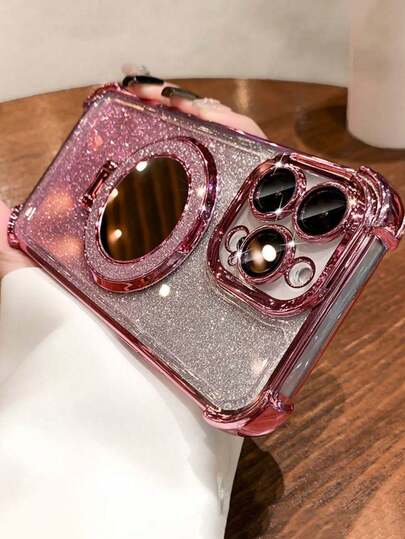 粉色奢华电镀闪粉透明镜面支架手机壳,兼容 17 Air 16 E 15 14 Plus 13 12 11 16 Pro,镜头保护防震保护套 - 粉色 - 查看 1