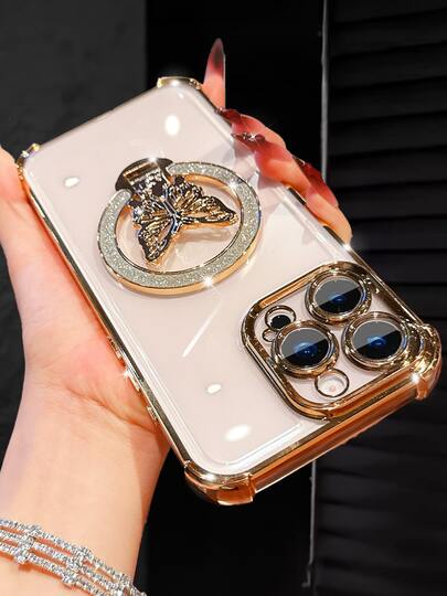 奢华电镀透明金色手机壳,创意蝴蝶支架,水钻闪粉,Y2K风格,防震,新款夏季时尚硅胶软壳保护套,兼容 16/16E/15/14/13/12/11/X/XS/XR/8/7 Plus/Pro/Max/Mini、Galaxy S24/S25 Ultra、Redmi、Honor、OPPO Reno、MOTO Infinix Women 2025等机型。 - 金色 - 查看 1