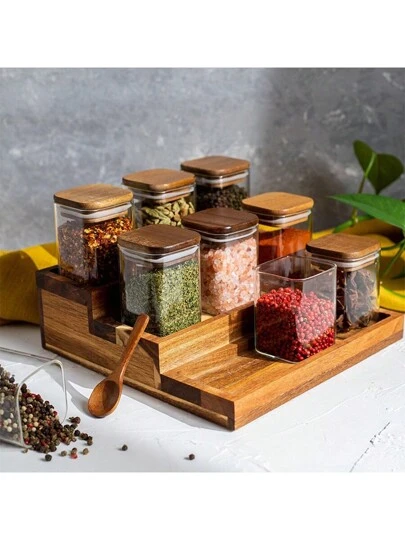 豪华小方形玻璃罐调味料储存瓶,厨房密封香料香草容器,高硼硅酸盐 - 方形相思木蓋密封罐 - 查看 12
