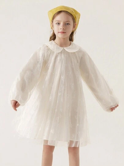 MARC&JANIE 少女的夢幻甜美刺繡網紗襯衫領泡泡袖裙,春季 - 米色 - 查看 1