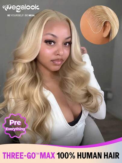 MEGALOOK 升级版 13x6 三合一™ 蜂蜜金渐变蕾丝前假发,自然波浪卷,100% 真人发丝 - 透明蕾丝,预剪预拔,隐形发结,易于佩戴,新手友好型无胶假发,6x5/13x4/13x6 蕾丝尺寸可选 - 无需胶水,新手友好,经久耐用,轻盈舒适,适合全天佩戴 - S12/613 - 查看 2