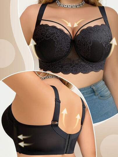 MIMILEMON 大码舒适蕾丝钢圈文胸 - 宽肩带,提拉,侧支撑,全罩杯设计,适合全天穿着,有效控制侧胸。 - 黑色 - 查看 4