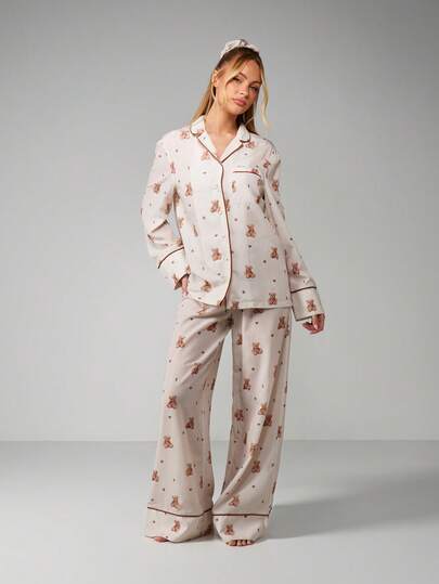 MISSGUIDED 圣诞泰迪熊印花纽扣前开睡衣套装长袖家居服 - 彩色 - 查看 1