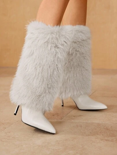 MOTF 毛茸茸的尖头高跟中筒靴,宽松的及膝靴,适合通勤、约会、派对和其他时尚场合