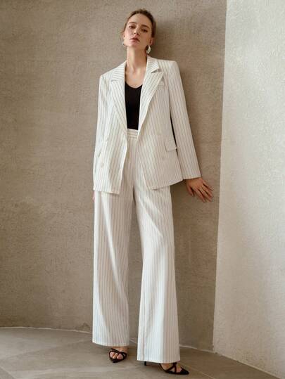 MOTF PREMIUM 休闲条纹亚麻质感通勤阔腿西装裤 - 白色 - 查看 1