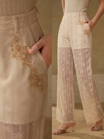 MOTF PREMIUM 蕾丝花朵拼贴西装裤 - 杏色 - 查看 1