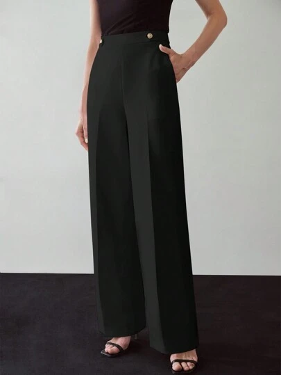 MOTF PREMIUM 纯金色纽扣细节斜口袋缝线前阔腿裤 - 黑色 - 查看 1
