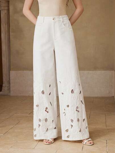 MOTF PREMIUM 女士春夏棉质镂空刺绣阔腿裤 - 白色 - 查看 1