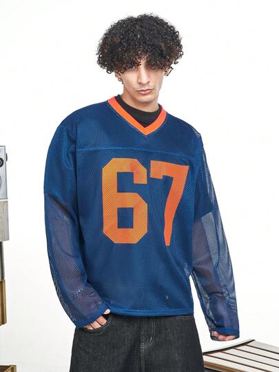 MT99 叠层印花运动衫,V领,透气网眼长袖,街头休闲时尚 - 藏蓝色 - 查看 4