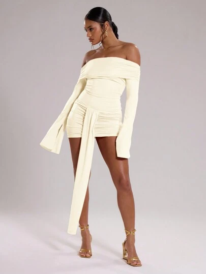 MUSERA 露肩褶皱垂褶迷你紧身连衣裙,春季优雅粉彩夏季伊比沙岛穿搭,假日海滩度假音乐会之夜生日派对约会派对休闲装扮 - 奶油色 - 查看 1