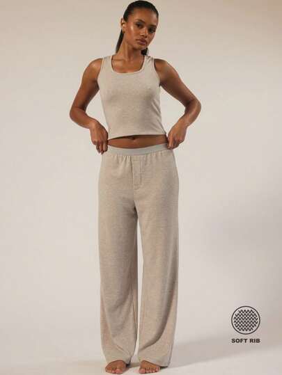 MUSERA ESSENTIALS 弹性腰身直筒柔软罗纹长裤,秋冬季日常舒适居家必备,春季度假休闲穿着。 - 淺灰色 - 查看 2