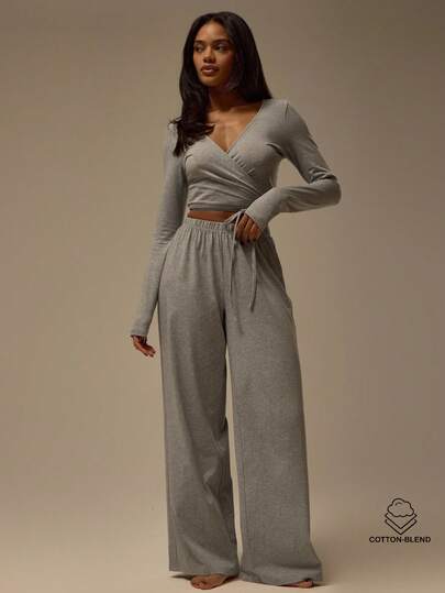 MUSERA ESSENTIALS 宽松阔腿棉质长裤套装(仅下装)舒适休闲可爱日常居家必备 - 灰色 - 查看 4