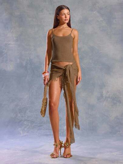 MUSERA 针织系带纱笼裙,适合春季、夏季、伊比沙岛、Y2K、酷女孩、音乐节、锐舞派对、度假、夜店、可爱冬季约会之夜派对等场合。 - 棕色 - 查看 1