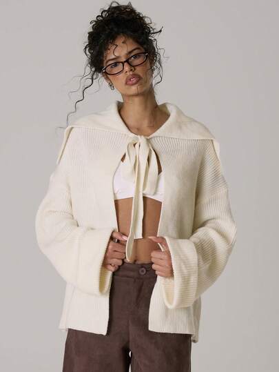 MUSERA 翻领细节,翻折袖口,柔软罗纹针织套头衫,休闲可爱,冬季舒适居家针织衫,Coco Cloud - 奶油色 - 查看 1